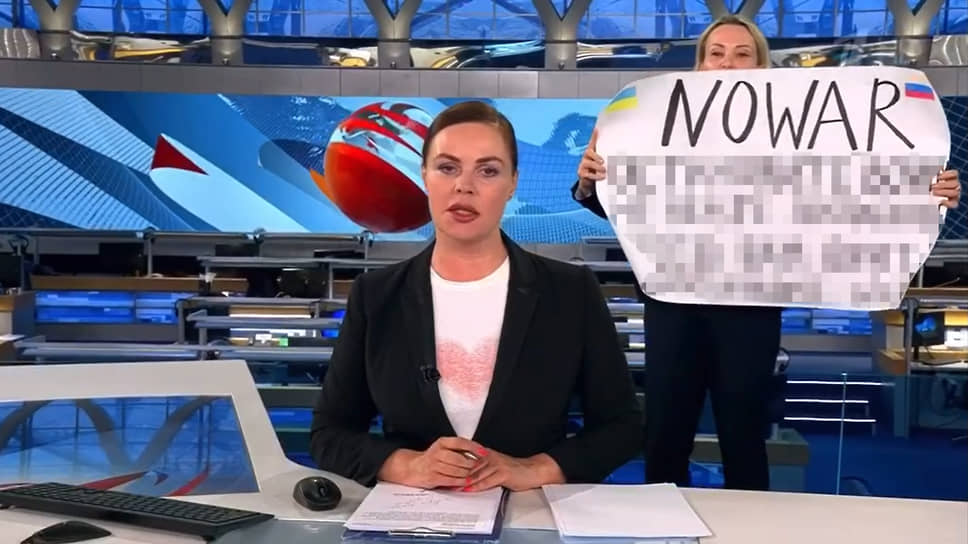 14 марта во время вечернего эфира программы «Время» на «Первом канале» одна из сотрудниц ворвалась в студию с антивоенным плакатом. Ей оказалась редактор телеканала Марина Овсянникова.