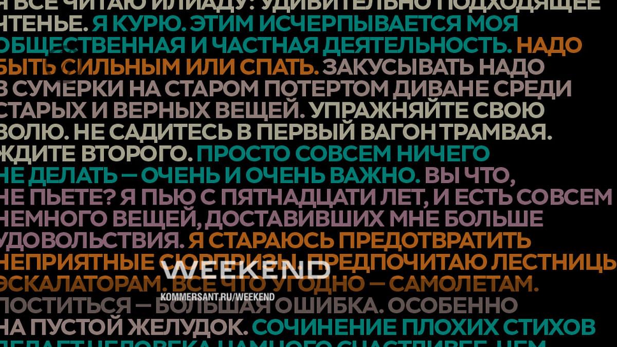 Не делать ничего — приносить пользу, читать только хорошие книги — читать всякую дрянь, пытаться забыть плохое — стараться запомнить все, остаться в одиночестве — быть среди близких, спать — но не зевать: жизненные стратегии людей, знавших толк в плохих временах, сильно разнятся, поэтому каждый может найти совет себе по вкусу. Впрочем, одно правило не оспаривается никем: выпивать и закусывать надо при любой возможности.