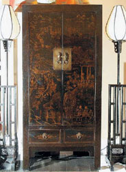 Самым выдающимся экспонатом можно считать шкаф с глухими дверцами, весомым латунным замком, который становится также и основным декоративным элементом. Дверцы покрыты традиционной для Китая живописью по лаку (правда, выполненной европейцем). Жанровые сценки из жизни древнего Китая, написанные тусклой золотой краской по черному лаку, выглядят изысканно (цена 117 189 руб.).