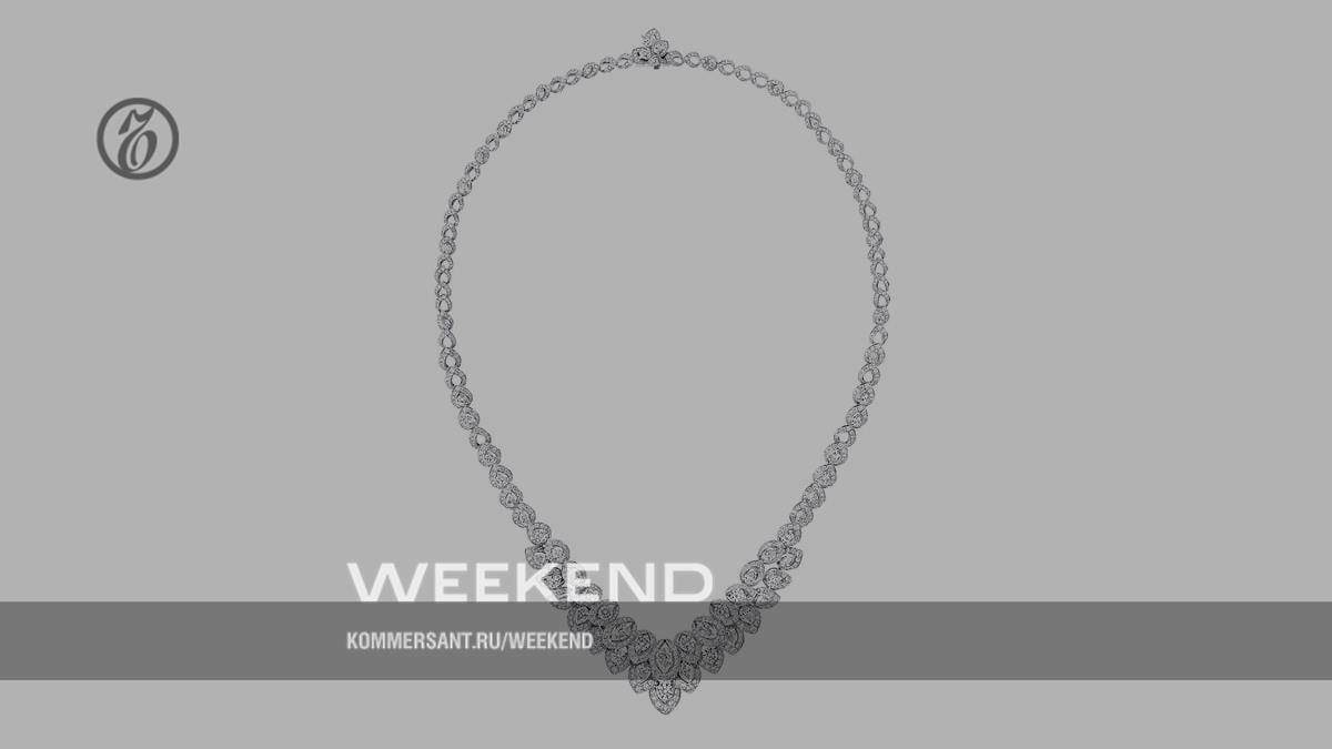 А там, где такой звездный элемент только один, он оборачивается уже дневной звездой, то есть солнцем. Вообще, восход солнца, появление солнечного диска над горизонтом и начало нового дня — один из центральных мотивов коллекции. Для Tribal сейчас сделали два кольца с мотивом солнца — в одном это восходящее солнце с острыми лучами, с белыми бриллиантами общим весом семь каратов, а в другом это полуденное солнце, его круглый сияющий диск, когда лучей почти не видно, а видна скорее корона, и тут она, вокруг центрального бриллианта круглой огранки, похожа на лепестки. Этот же солнечный диск мы узнаем в двух парах сережек — они очень похожи, только немного отличаются масштабом: в одних четыре карата бриллиантов, а в других три. А еще и в колье, где на тонкой цепочке, собранной из круглых бриллиантов, подвешен точно такой же центральный элемент в виде солнца-цветка. Из похожих элементов, лепестков-перышек-семечек, собрано одно из главных украшений коллекции, ожерелье, где они выложены в два ряда, внахлест, и повернуты под разным углом к основанию — 32 грушевидных бриллианта общим весом 5,58 карата и 1076 круглых бриллиантов весом 11,68 карата.