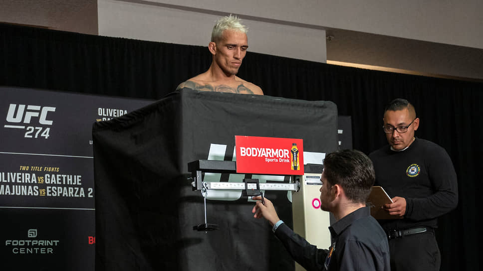 Бразилец, явившийся на церемонию за пять минут до ее окончания и выглядевший весьма потерянным, не сумел вписаться в максимально допустимый для дивизиона лимит — 70,3 кг. После первой попытки весы показали 70,7 кг. Тогда Оливейра попросил вынести ему ширму, чтобы полностью раздеться, но и это бойцу не помогло. Показатель, конечно, чуть улучшился и составлял уже 70,5 кг, однако все равно превышал максимальную норму на 200 г. UFC предоставил чемпиону дополнительное время — еще один час, но Чарльз Оливейра ничего со своим избыточным весом сделать не сумел.