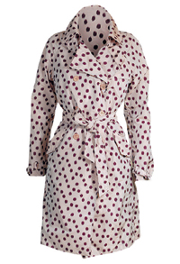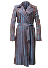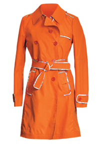 "Серебряный" тренч Burberry London — отрезной по талии, со слегка присборенной юбкой. Тренч Prada сшит из ярко-коралловой кожи питона. Плащ Lanvin — без подкладки и застежки, затягивающийся на мягкий пояс. Он сшит из галстучного шелка с классическим орнаментом в коричнево-синюю "рыбью кость". Первый плащ-дождевик обнаружен в коллекции Miu Miu (ЦУМ).