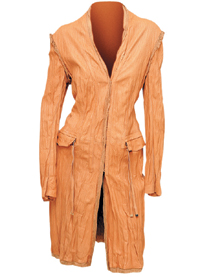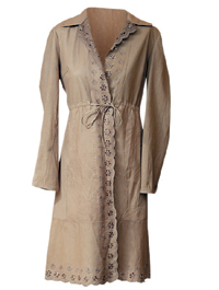 Плащ Roberto Cavalli выполнен из сильно измятой перфорированной "крестиками" ярко бежевой кожи и оторочен узкими рюшами из бежевого шифона. Замшевое пальто ярко-салатового цвета Ermano Scervino отделано оборками и перфорацией. Воротник бледно-зеленой замшевой куртки Gucci — волан из той же замши. Серо-бежевое кожаное пальто SportMax (MaxMara), с поясом-кулиской на завышенной линии талии, имеет почти кружевную перфорацию на полудетском круглом воротничке.