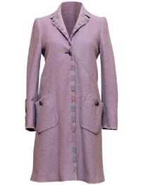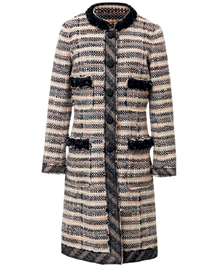 Плащ Ermano Scervino выполнен из шелковой черно-белой или розово-бордовой ткани в довольно крупный и как будто слегка "размытый" горох. Легкое пальто Etro — полуприталенное, с костюмными воротником и лацканами — сшито из розовой ткани в мелкий молочно-белый горошек. Пальто из знаменитого пестрого трикотажа с рисунком "зигзаг" от Missoni (Podium) также имеет классический "костюмный" фасон.