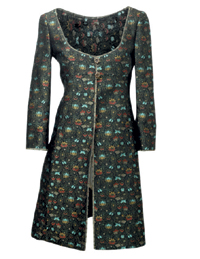 Тренч Moschino выполнен из шелковой салатово-розовой парчи с цветочным рисунком. Из розовато-бежевой парчи сшиты и классического костюмного покроя легкие пальто Byia (Aizel, Le Form). Ярко-салатовая с золотыми медальонами "индийская" парча использована для приталенных легких пальто Alberta Ferretti.