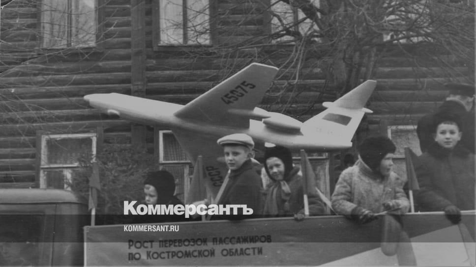 На детях зимняя одежда, так что на фото – явно не Первомай, а демонстрация, приуроченная к очередной годовщине Октября. Время действия – середина шестидесятых. Автомобиль – предположительно, бортовой грузовик УАЗ-451Д, – судя по самолету и надписи на плакате, представляет Костромской объединенный авиаотряд.