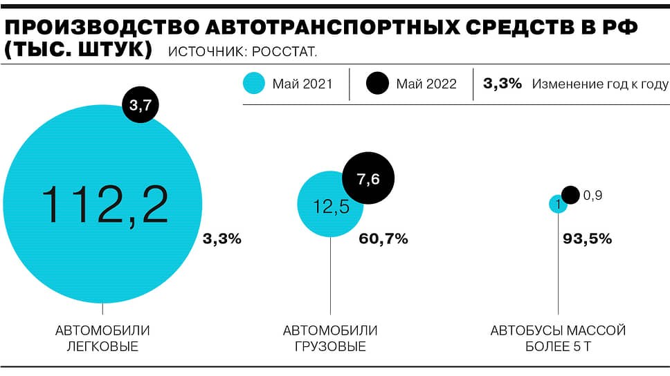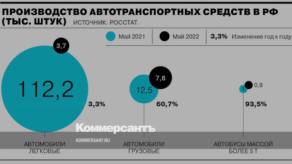 Росстат отчитался о сокращении производства автотранспортных средств в мае 2022 года. Выпуск легковых автомобилей упал на 96,7% год к году. Всего было произведено 3,7 тыс. штук. Производство грузовиков сократилось на 39,3%, до 7,6 тыс. штук. Выпуск автобусов массой свыше 5 т сократился незначительно — на 6,5%, до 928 штук.