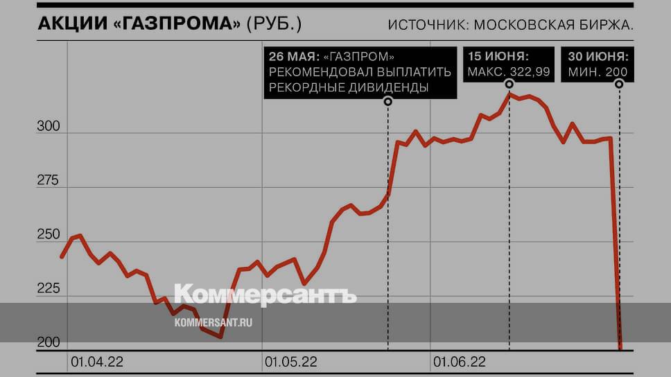 30 июня акции «Газпрома» обвалились более чем на 30% после решения годового собрания акционеров об отказе от выплаты дивидендов за 2021 год. В моменте они опускались до 200 руб. за акцию впервые с 25 февраля. Цена закрытия предыдущего дня — 297,65.