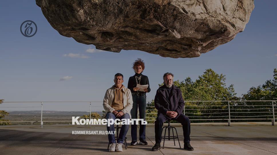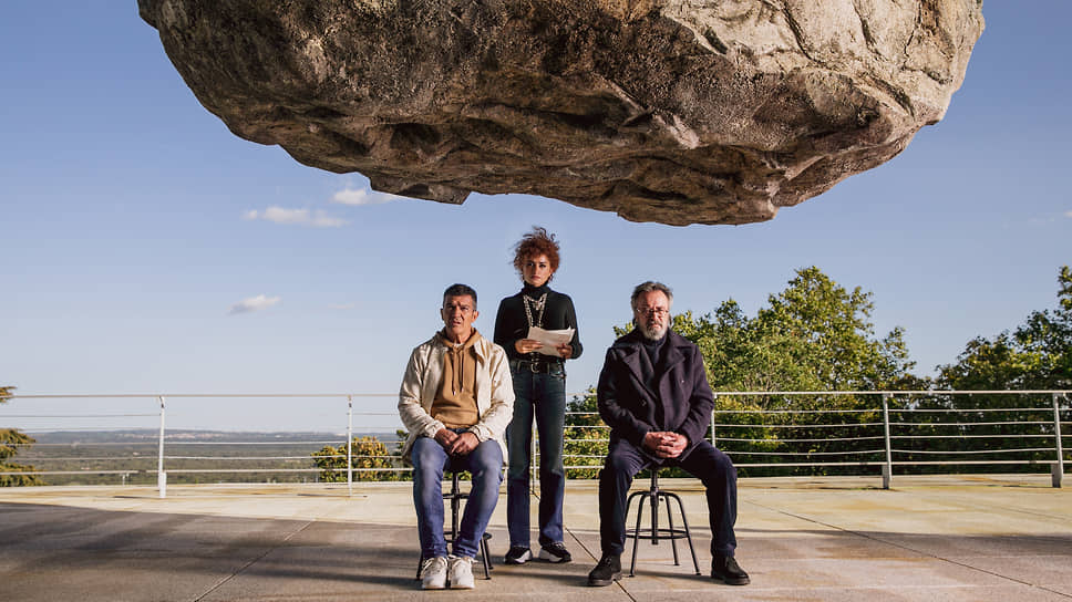 Режиссер Лола Куэвас (Пенелопа Крус) заставляет своих актеров (Антонио Бандерас и Оскар Мартинес) читать реплики, сидя под пятитонным камнем