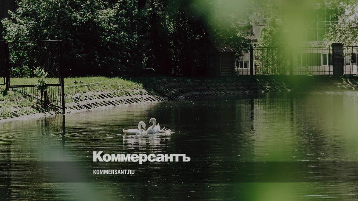 Пара лебедей в парке Аксакова. Лебеди-шипуны живут в парке с 2006 года — летом на озере, а зимой — в специальном вольере. Этот вид лебедей занесен в Красную книгу Башкирии