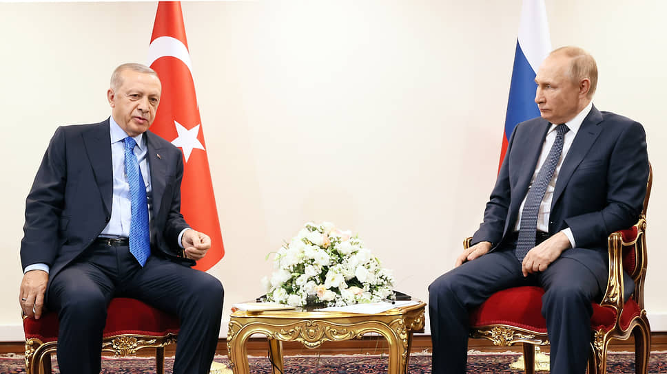 Президент Турции Реджеп Тайип Эрдоган (слева) и президент России Владимир Путин во время встречи