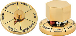 Если мужчина испытывает трудности в принятии решений или, наоборот, решает все и навсегда слишком безоговорочно, на podarok.ru можно найти два мужских варианта "принимателей решений". Один решает все в бизнесе, имеет цвет чистого золота и подсказывает, куда вложить — "в себя, в налоги, в дело" и т. п. (930 руб.). Другой охватывает все области бытия и выдает ответы самой широкой направленности: "остынь, смени курс, пора в отпуск" (950 руб.).