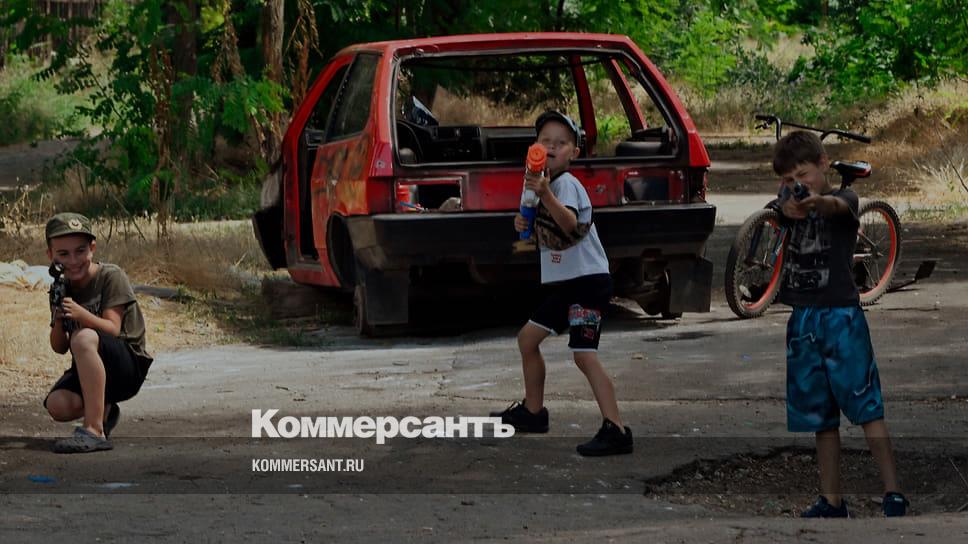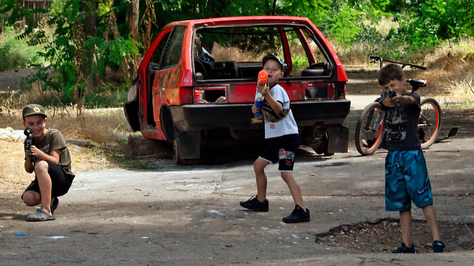 Дети играют в салоне разбитого автомобиля, Мариуполь