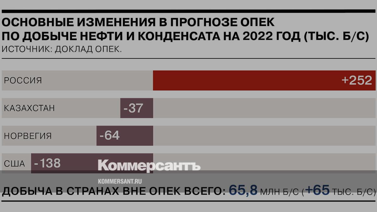 Организация стран—экспортеров нефти в своем ежемесячном аналитическом докладе повысила прогноз по добыче жидких углеводородов (нефти и газового конденсата) в России в 2022 году на 0,25 млн б/с. Добыча в 2022 году ожидается на уровне 10,88 млн б/с по сравнению с 10,63 млн б/с в июльском докладе. Пересмотр объясняется более высоким, чем ожидалось ранее, уровнем производства в последние два месяца.
