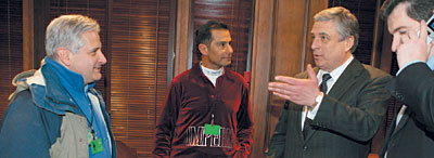 Павел Бородин (второй справа) напутствовал участников московского турнира по поло на снегу Виктора Уако (в центре) и Алексиса Родзянко (слева)