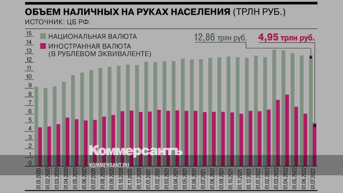 Россияне продолжают избавляться от иностранной валюты, свидетельствуют данные ЦБ. Объем наличной валюты в рублевом эквиваленте по итогам июня сократился до 4,95 трлн руб. с 6 трлн руб. месяцем ранее. На максимуме, зафиксированном 1 апреля, он превышал 8 трлн руб.