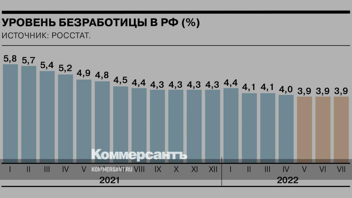 Уровень безработицы в России третий месяц подряд остается на рекордно низком уровне 3,9%, свидетельствуют данные Росстата. Предыдущий минимальный уровень 4% был зафиксирован в апреле. В 2021 году средний уровень месячной безработицы составлял 4,8%.