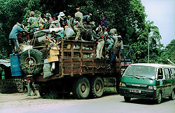 Появление белого человека с фотоаппаратом вызвало в Пото-Пото оживление. "Эй, француз, забери нас в Париж",— несколько молоденьких девушек, дурачась, позируют перед камерой. Появляется большой грузовик, доверху заполненный тюками, мешками и канистрами. Поверх всего этого сидят люди. Пытаюсь их заснять. Пассажиры грузовика недовольны, в мою сторону летят камни. Мои спутники нервничают и почти насильно усаживают меня в машину.