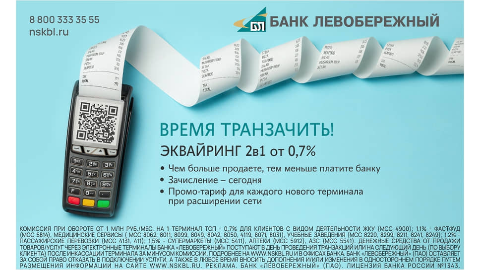 Банк «Левобережный» предлагает гибкие условия по эквайрингу в зависимости от объема оборота. Благодаря этому, предприниматели с 1 сентября могут подключить торговые терминалы по низкой ставке от 0,7%.