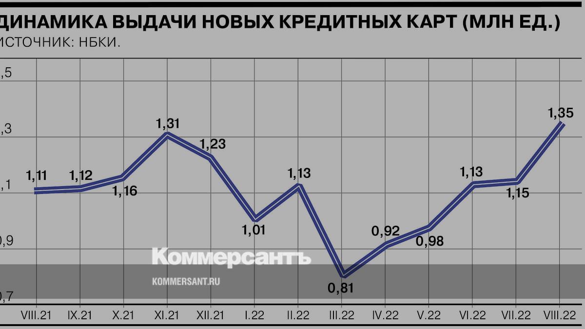 Количество выданных новых кредитных карт в августе 2022 года выросло к июлю на 17,6%, до 1,35 млн штук. Год к году оно увеличилось на 21,5%. Сегмент кредитных карт полностью восстановился и демонстрирует наивысшие показатели выдачи более чем за полтора года, сообщает НБКИ.