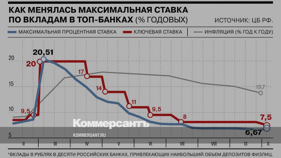 Средняя максимальная процентная ставка по рублевым вкладам в десяти крупнейших банках РФ, привлекающих наибольший объем депозитов, в первой декаде октября увеличилась на 0,13 п. п. до 6,67%. Напомним, максимальный размер процентной ставки был зафиксирован в первой декаде марта после решения Центробанка поднять ключевую ставку сразу до 20%. С тех пор она снижалась и достигла минимального показателя в 6,54% к концу сентября. За весь период незначительный рост ставок (на 0,03 п. п.) был зафиксирован лишь во второй декаде августа.