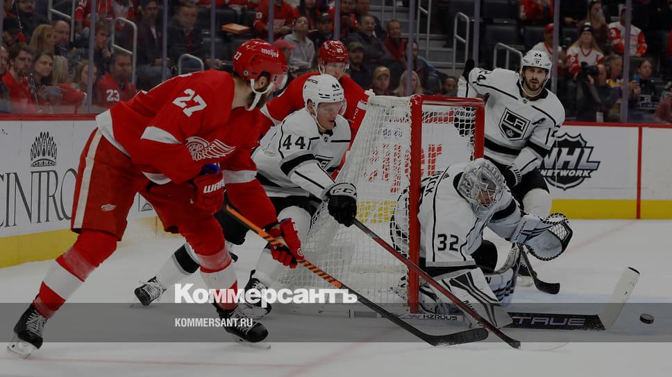 Момент матча регулярного чемпионата НХЛ между клубами «Детройт Ред Уингз» (в красной форме) и «Лос-Анджелес Кингз»