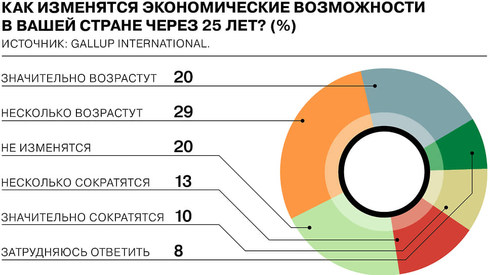 Показатели по России в целом соответствуют общемировым, показало исследование холдинга «Ромир». Среди россиян 40% ожидают, что экономические возможности в стране через четверть века в той или иной степени возрастут, 13% — что сократятся. Четверть опрошенных затруднилась дать ответ о будущем экономики.