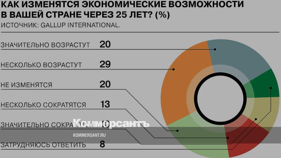 Каждый второй житель Земли (49%) уверен, что в течение следующих 25 лет экономические возможности в его стране в той или иной степени возрастут, показало глобальное исследование Gallup International, посвященное 75-летию организации. Больше всего верящих в значительный рост экономических возможностей живет во Вьетнаме (80%) и Гане (59%), меньше всего — в Иордании (19%) и Афганистане (20%).