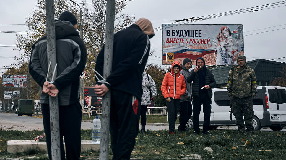 В обращении, опубликованном на сайте СПЧ, рассказывается про фотографию агентства Associated Press, на которой изображены двое мужчин, прикованных к уличным столбам в Херсоне. Члены комиссии обращают внимание на то, что люди на фотографии прикованы пластиковыми наручниками. В СПЧ утверждают, что на Украине такие наручники используют правоохранительные органы, в том числе Служба безопасности Украины.