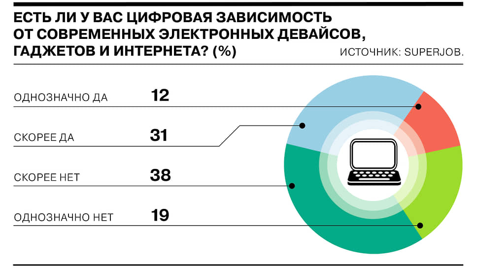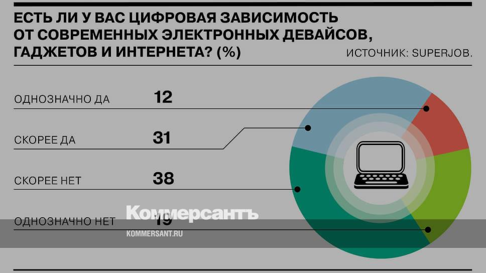 Более 40% россиян считают себя зависимыми от современных электронных девайсов, гаджетов и интернета, показал опрос исследовательской службы SuperJob. Абсолютно уверены в этом 12% респондентов, склоняется к такому мнению 31% опрошенных. Чаще всего подвержена цифровой зависимости молодежь — более 50% ответивших «да» в этой возрастной группе.