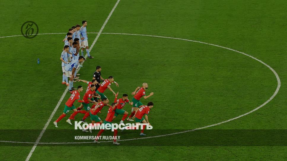 В 1/8 финала чемпионата мира сборная Марокко (в красно-зеленой форме) взяла верх в серии послематчевых пенальти над одним из фаворитов турнира — Испанией