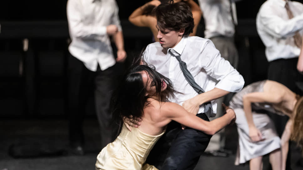 «Я женщина респектабельная и замужняя»,— рапортует теперь на парижской сцене Эва Гринстайн (блестящий финал карьеры 42-летней «первой танцовщицы»). Спина у нее стальная, походка от бедра — напористая, шпильки впиваются в сцену, взгляд — в зал. Но стоит появиться мужчине — респектабельности как не бывало. В его жадных руках она становится безвольной куклой или агрессивной истеричкой, одно из двух. «Женщина», «платье», «материал» — для Бауш эти слова, по сути, однокоренные, отсюда и бесконечные переодевания: не в этом платье, так в другом жизнь, глядишь, и наладится. Мужчины при этом подчеркнуто остаются застегнутыми на все пуговицы — так хореограф подчеркивает их ригидность. Отношения с противоположным полом выступают главным критерием жизненного успеха ее героев, этих ранимых невротиков, беспрестанно ищущих близости. На свои жизни они смотрят сквозь призму отношений — а отношения не складываются, всюду трещины. Любой контакт, начинающийся вполне невинно и даже нежно, оборачивается насилием. То обоюдным: улыбчивые пары попеременно выходят на авансцену и с нескрываемым удовольствием отвешивают своим визави подзатыльники, тянут друг друга за соски, за мочку уха и всячески изощряются в жестокостях. То мазохистским: улегшись на пол, мужчина в очках истязает себя, сбрасывая на живот тяжеленный диск от штанги (Жермен Луве — других этуалей нет в прекрасном артистическом ансамбле, составленном преимущественно из артистов кордебалета и солисток). А то и групповым. Истерзанная девушка в пастельном платье-хитоне (отличная работа корифейки Шарлотт Рансон), которая еще в начале спектакля возбужденно взвизгивала от вида дохлой крысы, под конец охладеет и к крысе, и к мужским домогательствам — после того как многочисленные руки будут лапать ее безвольное тело. А ведь начиналось все с невинных поглаживаний. Даже у уток в документальном кино, которое герои внимательно усаживаются смотреть в начале второго акта,— и у тех ничего в личной жизни не складывается, что уж говорить про людей.