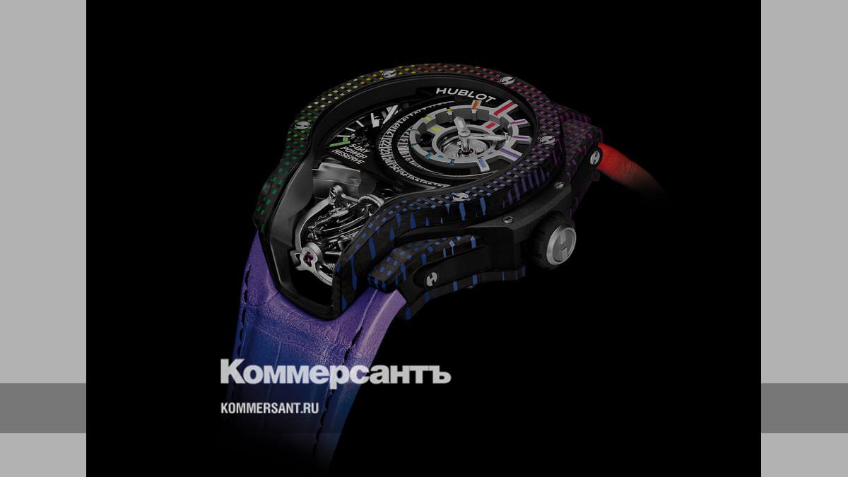 В основе дизайна MP-09 Tourbillon Bi-Axis 5-Day Power Reserve — радуга. Не новая для Hublot тема, мы помним и Big Bang Unico King Gold Rainbow и Classic Fusion Takashi Murakami Sapphire Rainbow с радужным цветочком, и титановую «радугу». Но до сих пор радуга была драгоценная — из камней, которые геммологи компании подбирали годами, чтобы цветовые переходы были плавными. Для MP-09 Tourbillon Bi-Axis радугу вшили прямиком в 49-миллиметровый корпус из трехмерного углеволокна с помощью цветных композитных вставок. Кажется, что создать рисунок на карбоне проще, чем подобрать и инкрустировать в корпус камни. Но это далеко не так. По сути, корпус этих часов образован плетением тонких полосок углеволокна, расположенных на расстоянии нескольких миллиметров друг от друга. После этого в промежутки между ними вертикально укладывают полоски цветного композита, которые слегка выступают над углеволокном. Перепад уровня выравнивают третьим слоем, снова из углеволокна, чтобы получилось единое целое. Поверхность новой модели MP-09 выглядит совершенно гладкой и кажется отполированной, но полировки не было, просто каждый установленный элемент обработан с точностью до микрона и плотно встает в паз.