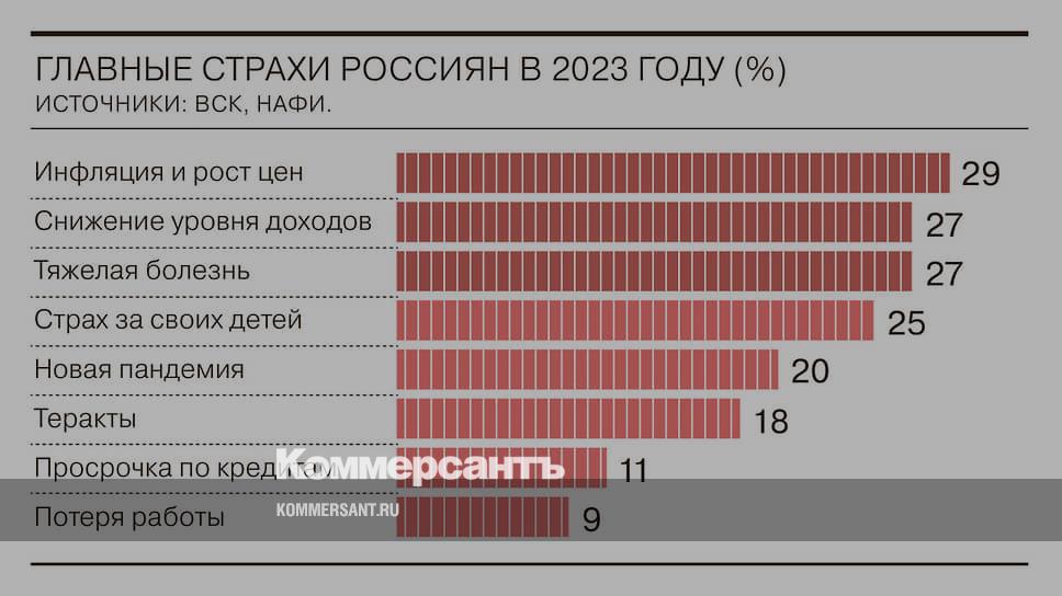 Главные страхи россиян в 2023 году — рост цен, снижение доходов и болезни, показал совместный опрос Страхового дома ВСК и аналитического центра НАФИ. Этого боится почти треть респондентов. Каждый четвертый опасается за детей, каждый пятый — новой пандемии. Среди других страхов, которые испытывают не более 10% опрошенных: дефицит продуктов питания и лекарств, погодные аномалии, травмы, отсутствие возможности путешествовать, обман мошенниками, несчастный случай с квартирой или домом, автомобильная катастрофа. 3% опасаются, что в 2023 году наступит конец света.