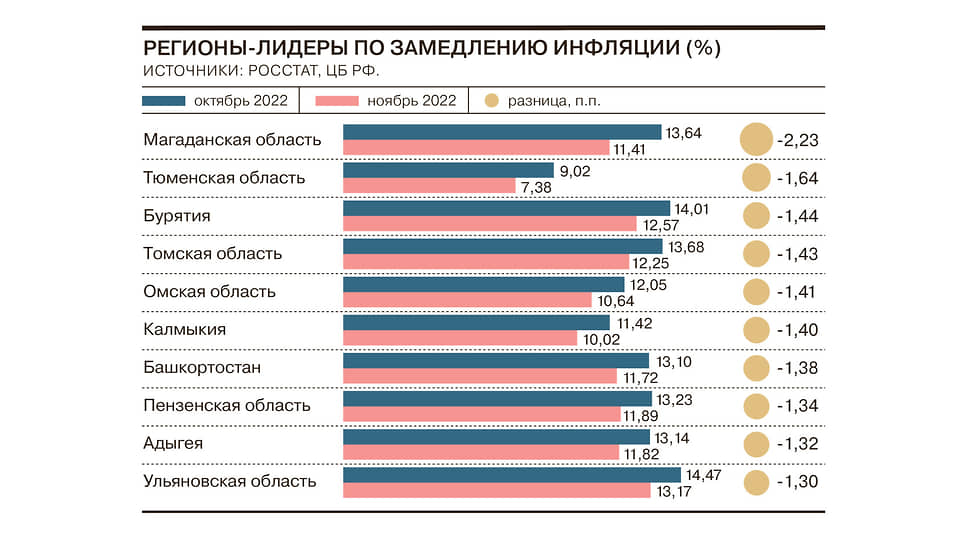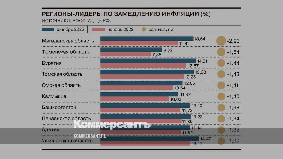 Лидерами по замедлению роста цен стали Магаданская, Тюменская области и Бурятия. Рост цен зафиксирован в шести регионах, в пяти он оказался выше, чем по России в целом (11,98%). Инфляция там ускорилась за счет сокращения предложения ряда товаров, увеличения издержек производителей и роста спроса на некоторые услуги.