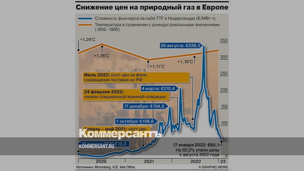 Цены на природный газ в ЕС сократились до 17-месячного минимума (около €60 за МВт•ч). По сравнению с пиковыми значениями конца августа 2022 года они упали на 82%. Необычно теплая погода, установившаяся в большей части Европы со второй половины декабря, привела к снижению спроса, связанного с отопительным сезоном. Эксперты не ждут резкого изменения ситуации даже в случае возвращения морозов. Этому способствуют беспрецедентно высокие запасы газа в европейских подземных хранилищах и стабильные поставки СПГ.