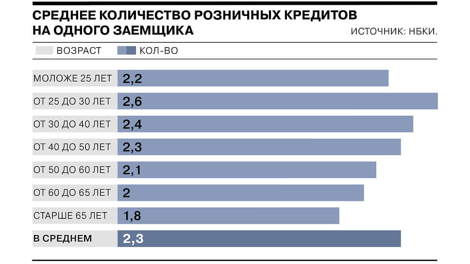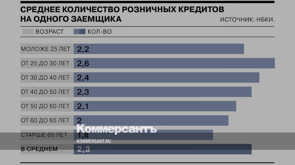 По данным Национального бюро кредитных историй (НБКИ) на декабрь 2022 года, среднее количество действующих кредитов у одного российского заемщика составляло 2,3 единицы. Эта цифра практически не изменилась по сравнению с декабрем 2021 года (2,2 кредита). Больше всего кредитов у россиян в возрасте от 25 до 30 лет (в среднем по 2,6 на каждого). Наименьшая кредитная нагрузка у заемщиков в возрасте старше 65 лет (1,8 кредита).