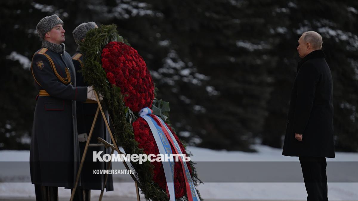 Кремль также опубликовал фотографию. На ней видно, как господин Путин один стоит напротив двух военных, держащих венок из красных цветов и еловых веток. Перед возложением цветов президент поздравил министра обороны Сергея Шойгу с Днем защитника Отечества и пожал ему руку.