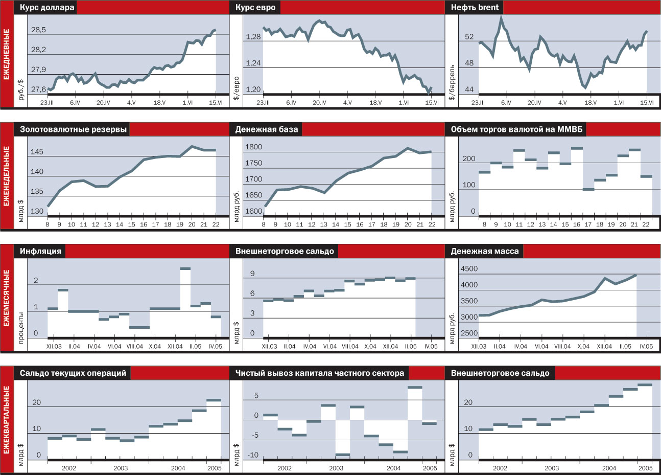 Несмотря на рост волатильности курса доллара на российском рынке, Центробанк значительно снизил свою активность. За май объем валютных интервенций составил $4,3 млрд, сократившись на 30% по сравнению с апрелем. Судя по всему, активность в июне снизилась еще сильнее — большие объемы торгов (более $2 млрд) на ММВБ стали редким явлением. В результате золотовалютные резервы застыли на одном уровне. На последнюю отчетную дату, 10 июня, они составляли $146,5 млрд, не изменившись за предшествующую неделю.