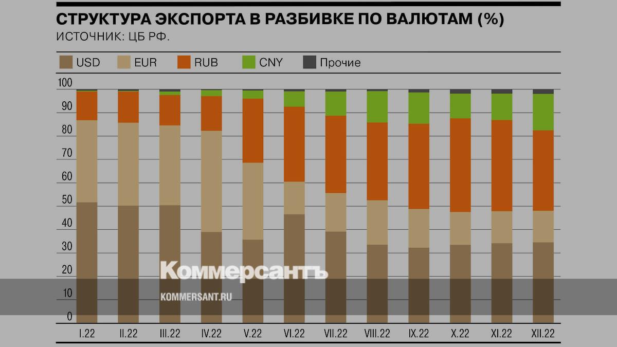 Доля расчетов по экспорту в валютах «недружественных» стран (в основном в долларах и евро) сократилась с 87% на начало 2022 года до 48% на конец, следует из Обзора рисков финансовых рынков Банка России. Альтернативной валютой помимо российских рублей стали юани. Доля китайской валюты в экспортных расчетах, не превышавшая 0,5% в январе 2022 года, к декабрю увеличилась до 16%. На рубли на конец года приходилось 34%, на прочие валюты дружественных стран — 2%.