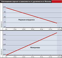 Небольшая удаленность предприятия от Москвы (в пределах 30 км) практически никак не сказывается на заработных платах сотрудников. Дополнительные расходы на дорогу (как среднему менеджменту, так и рядовым сотрудникам) компании редко компенсируют — гораздо проще и дешевле бывает организовать рейсовый автобус, который доставит всех московских работников от станции метро до места. Предприятиям, удаленным от Москвы более чем на 30 км, часто приходится переплачивать менеджерам, а если учесть, что сотруднику придется компенсировать съем квартиры, релокация специалиста дорого может обойтись компании.