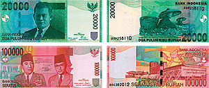 На лицевой стороне банкнота номиналом 100 000 рупий, размером 152 x 65 мм, помещены портреты первого президента страны Ахмеда Сукарно и вице-президента Мохаммада Хатта. На обороте изображено здание Банка Индонезии. Банкнот защищен водяным знаком в виде портрета Ваге Рудольфа Сопратмана. Защитная полоса с повторяющимся по всей длине микротекстом "BI 100000" проходит в центре. Основные цвета банкнота — бирюзовый, розовый и карминный.