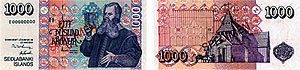 Новый банкнот 1000 крон сохранил дизайн и цветовую гамму своего предшественника, выпущенного в 1981 году. Добавлены современные средства защиты. На лицевой стороне нового банкнота номиналом 1000 крон, размером 150 x 70 мм, помещен портрет Бриньолфура Свейнссона. На обороте изображена церковь в Бриньолфе. Банкнот защищен водяным знаком в виде портрета Йона Сигурдссона. Книга в руках Бриньолфура Свейнссона на лицевой стороне банкнота выполнена металлизированной краской. Металлизированная ныряющая защитная полоса с повторяющимся микротекстом "1000KR" по всей длине проходит в центре. Основные цвета банкнота — розовый, карамельный и лиловый.