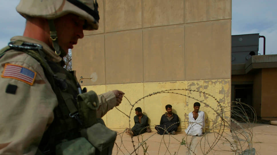 Американский солдат охраняет военнопленных на авиабазе Балад недалеко от Багдада во время войны в Ираке (апрель 2003 года)