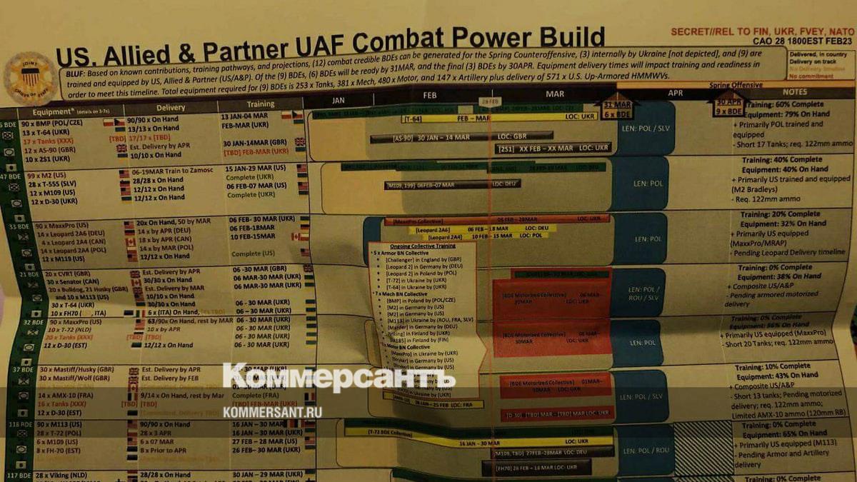 NYT ссылается на высокопоставленных представителей администрации США. По данным издания, в документах с грифом «совершенно секретно» оценивается «статус конфликта по состоянию на 1 марта». Их распространили в Twitter и Telegram. В частности, приводятся фотографии графиков ожидаемых поставок оружия, а также упоминаются численность войск и батальонов Украины, но «нет конкретных боевых планов» — например, как, когда и где она намерена начать наступление.