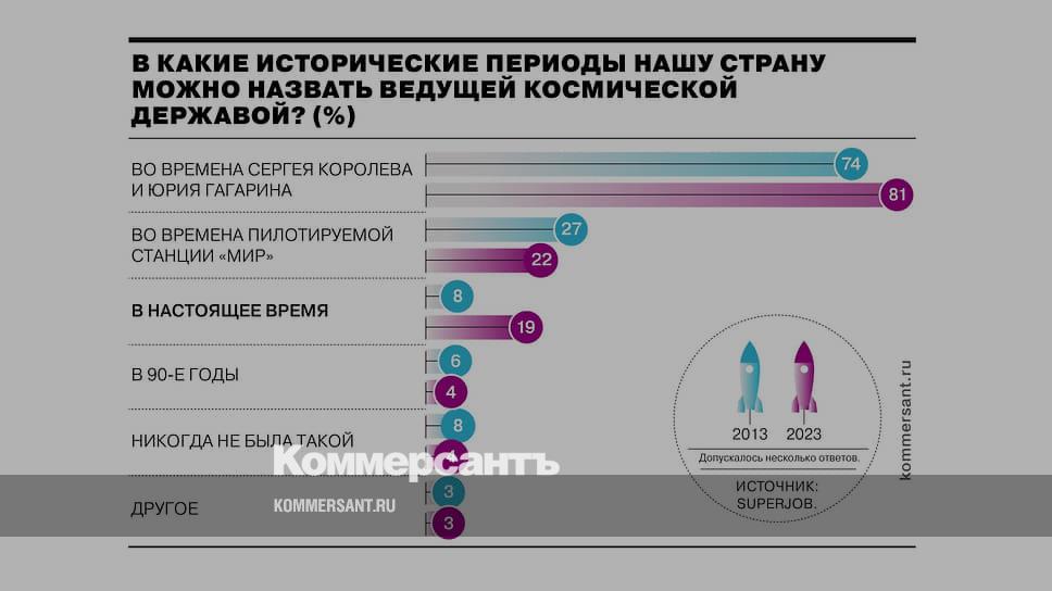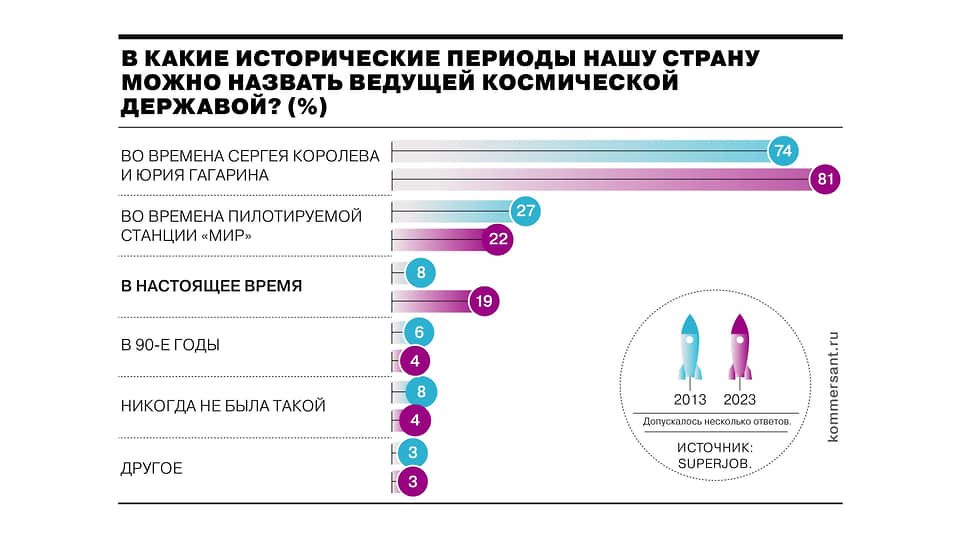Как показал опрос исследовательского центра Superjob, каждый пятый россиянин (19%) считает нашу страну ведущей космической державой. За последние десять лет доля респондентов, уверенных, что в настоящее время Россия занимает такое положение, выросло более чем вдвое. Большинство опрошенных (81%) считают, что ведущей космической державой наша страна была во времена Сергея Королева и Юрия Гагарина. 22% убеждены, что пик развития космической отрасли пришелся на времена пилотируемой станции «Мир». О лидирующем положении страны сегодня чаще говорят россияне в возрасте от 35 до 44 лет, славное космическое прошлое упоминают респонденты в возрастной группе 45 лет и старше.