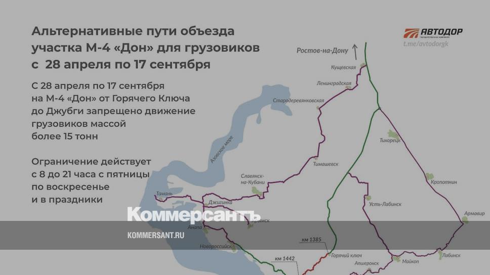 С 28 апреля по 17 сентября на трассе М-4 «Дон» от Горячего Ключа до Джубги ограничат движение грузовиков с разрешенной максимальной массой более 15 тонн. Об этом сообщает пресс-служба ГК «Автодор».