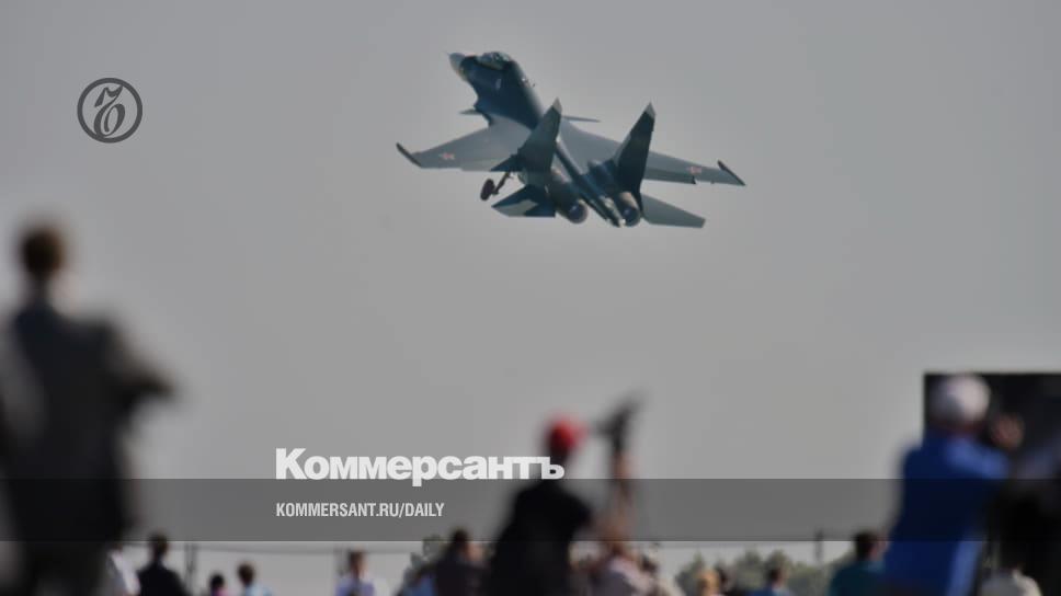 Истребитель Су-30 во время показательного полета на авиационной выставке