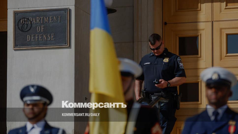 Почетный караул с украинским флагом был выставлен возле министерства обороны США по случаю визита премьер-министра Дениса Шмыгаля (апрель 2023 года)