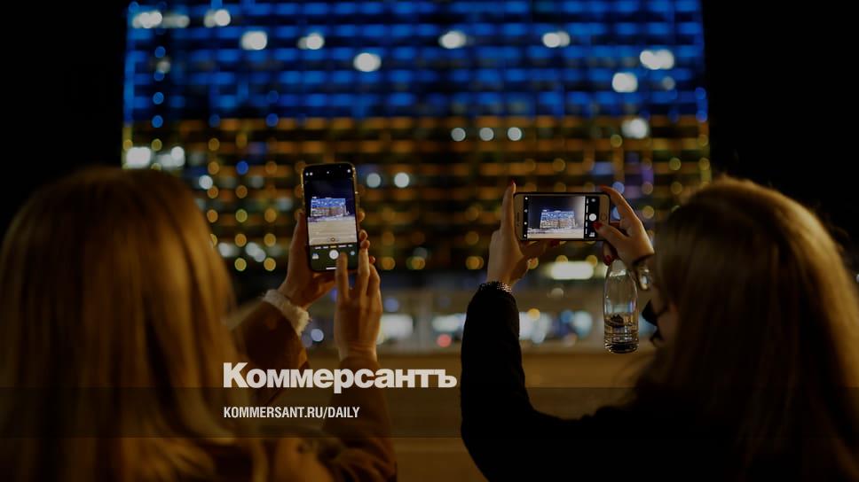 Здание муниципалитета Тель-Авива, подсвеченное в цвета украинского флага